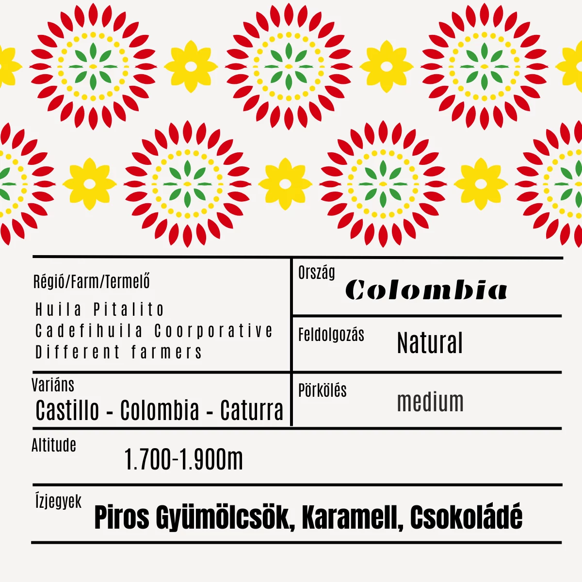 Ez a kávé a napsütötte kolumbiai domboldalak és a gondos kezek találkozásának gyümölcse. A Huila régióra jellemző vulkanikus talaj és a természetes feldolgozásmód egy rendkívül gazdag, édes karaktert eredményezett, amelyben a vibráló gyümölcsösség és a selymes kényeztetés kéz a kézben jár. Tökéletes választás azoknak, akik egy klasszikus profilú, mégis izgalmasan komplex specialty élményre vágynak minden reggel. A kortyot azonnal dominálják a piros bogyós gyümölcsök érett, lédús jegyei, melyeket egyfajta természetes édesség ölel körbe. Ahogy a kávé hűl, előtérbe kerül a karamell krémessége, a lecsengésben pedig hosszan megmarad a prémium étcsokoládé elegáns, telt utóíze. Karakteres testessége és édessége miatt kiváló választás automata kávégépekhez és karos eszpresszóhoz, de egy kotyogósban is meglepően édes eredményt ad. Feketén fogyasztva mutatja meg igazi gyümölcsös arcát, de egy krémes cappuccinóban a csokoládés-karamelles jegyei valósággal életre kelnek.