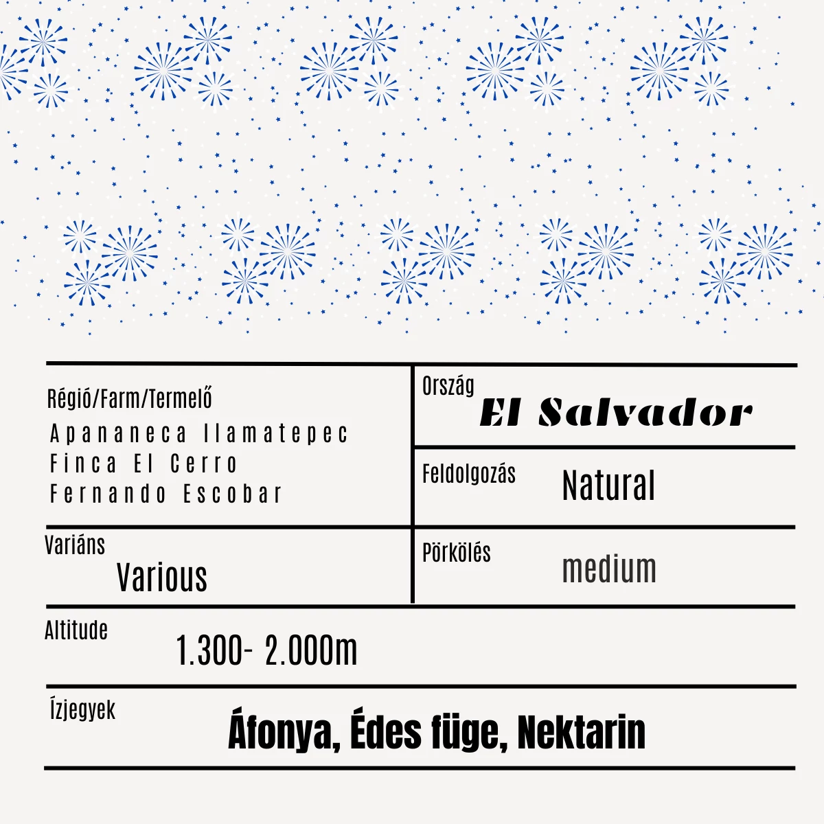 Ez az El Salvadori specialty kávé az Apaneca Ilamatepec régió magasan fekvő farmjáról, a Finca El Cerro-ról származik, ahol Fernando Escobar gondos keze alatt készül minden tétel. A 1.300–2.000 méteres magasság és a natural feldolgozás gazdag, komplex ízprofilt biztosít, amelyet a helyi terroir és a gondos pörkölés tesz igazán különlegessé.