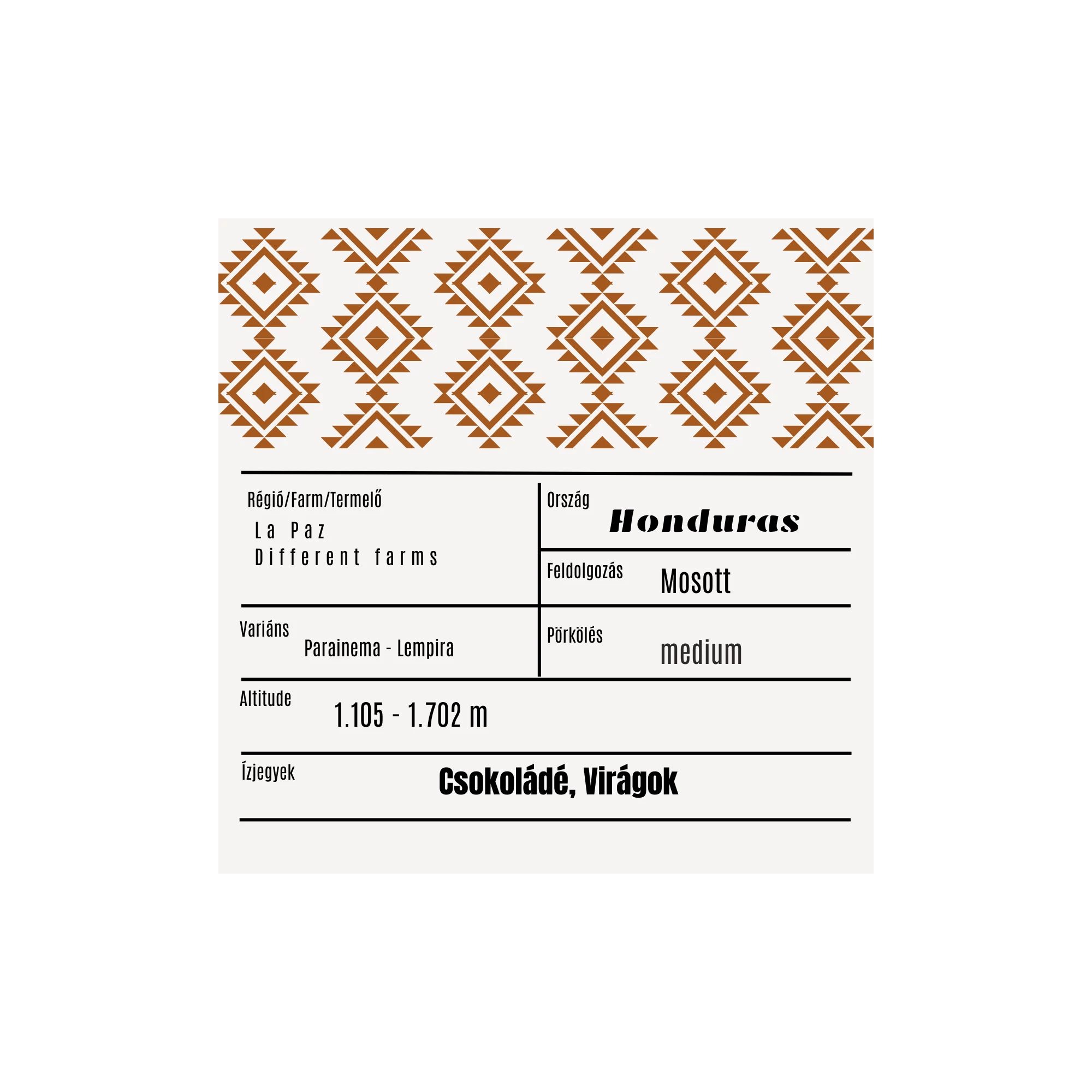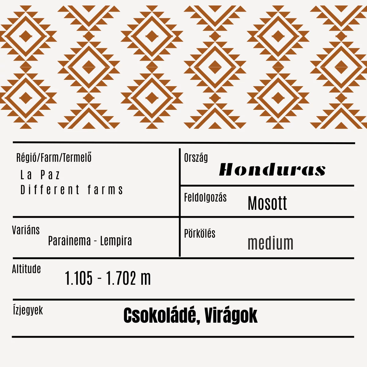 Ez a hondurasi specialty kávé a La Paz régió különböző, gondosan kiválasztott farmjairól származik, több helyi termelő együttműködésének eredményeként. Az 1.105–1.702 méteres tengerszint feletti magasság és a mosott feldolgozás tiszta, kiegyensúlyozott ízvilágot eredményez.
